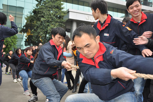 拔河比賽每條隊(duì)伍由7名女員工、3名男員工組成,首兩輪采用淘汰制,最后一輪則是循環(huán)賽,直至賽出冠、亞、季軍。比賽當(dāng)天,陽(yáng)光明媚,賽場(chǎng)的氣氛格外熱烈。